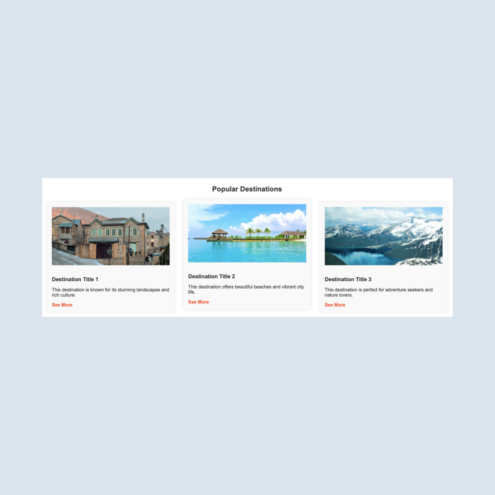 • Popular Destinations: Grid or masonry layout with high-quality images and brief descriptions.